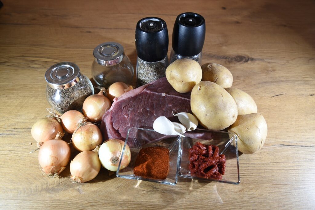 Zwiebeln, Rindfleisch, Kartoffeln und Knoblauch klein würfelig schneiden. In Etappen das Rindfleisch braun anbraten und beiseite stellen. Zwiebeln anrösten, das Rindfleisch und Tomatenmark dazu geben und weiterrösten. Paprika und Knoblauch dazugeben, mit ein wenig Gemüsebrühe aufgießen.