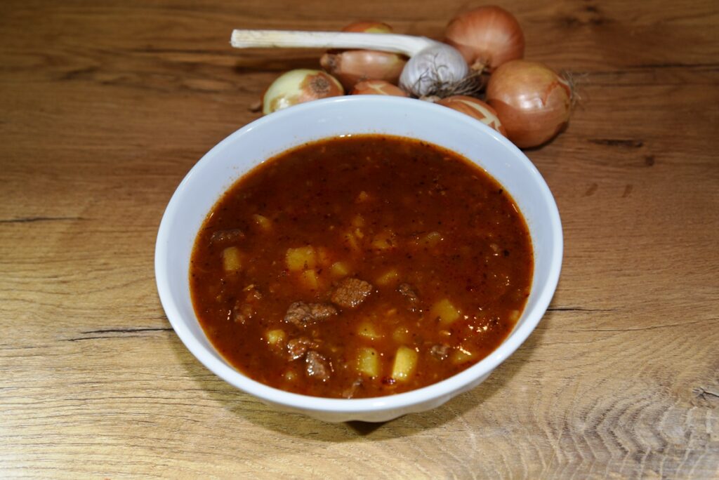 Die Gulaschsuppe schmeckt am besten mit einer Semmel und einem kühlen Gösser Bier. Mahlzeit!