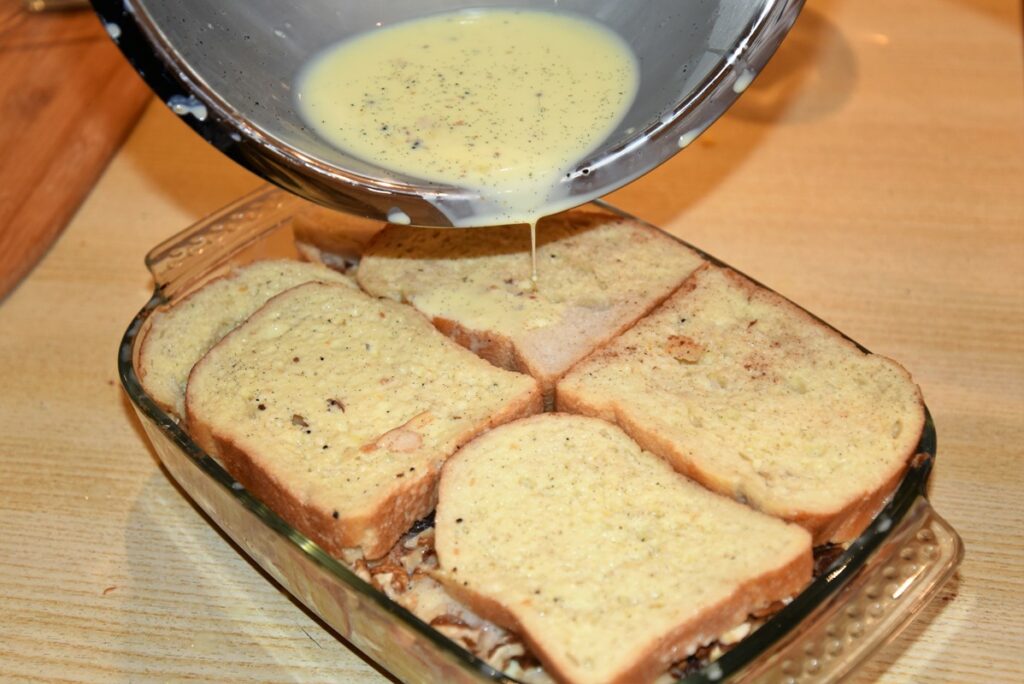 - Brot durch die Milchflüssigkeit ziehen und in eine Auflaufform geben.