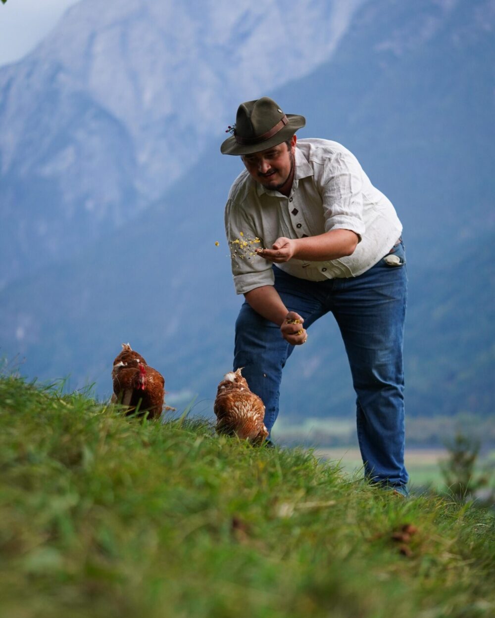 Jeden Morgen können die Hühner in den Außenbereich, um sich zu bewegen und zu scharren. Zweimal täglich wird ein kontrollierendes Auge auf sie geworfen, um sicherzustellen, dass es den Hühnern auch an nichts fehlt. Wird bemerkt, dass ein Huhn schlecht gelaunt ist, wird dieser Zustand durch ein paar Streicheleinheiten kurzerhand umgekehrt. Das gilt allerdings nur für braune Hühner, da ihre weißen Artgenossinnen lieber für sich bleiben. Bei diesem Einsatz für das Wohlergehen der Hühner ist es kein Wunder, dass das „Osttiroler HochBerg-Ei“ so hervorragend schmeckt und das Nationalpark-Gütesiegel trägt.