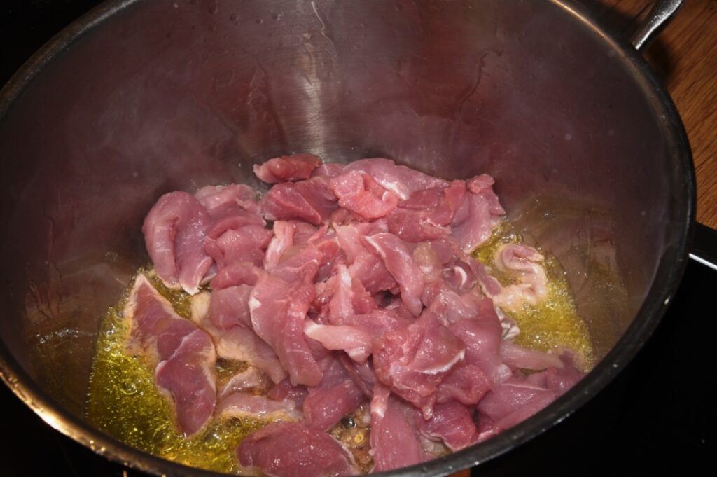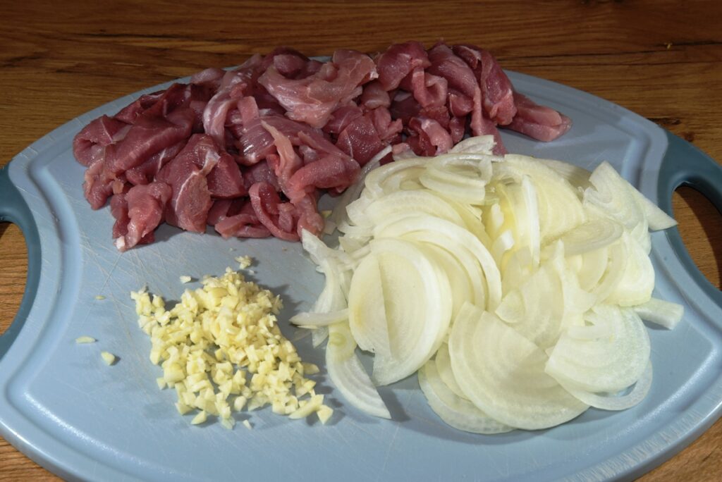 Fleisch und Zwiebel in dünne Streifen, Knoblauch würfelig schneiden. Schmalz erhitzen und das Fleisch darin gut anbraten – gleich salzen und pfeffern. Anschließend Zwiebel dazugeben und mit rösten.