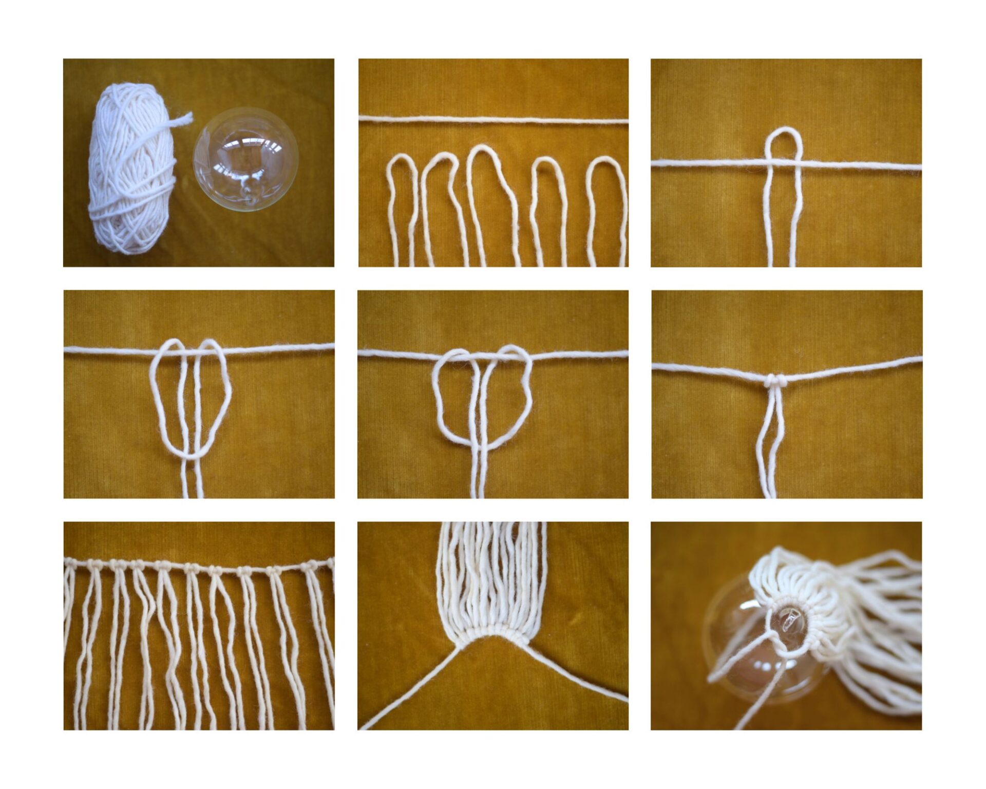 Der Wickelknoten hält alles zusammen und sieht dekorativ aus! Die einzelnen Fäden können noch vorsichtiger straffer gezogen werden, sodass das Netz sich schön um die Glaskugel spannt. Am Ende werden die nach unten hängenden Fäden dekorativ in der gewünschten Länge abgeschnitten und fertig ist sie, die Transformation von Rohmaterial zu einem dekorativem Weihnachtsschmuck.