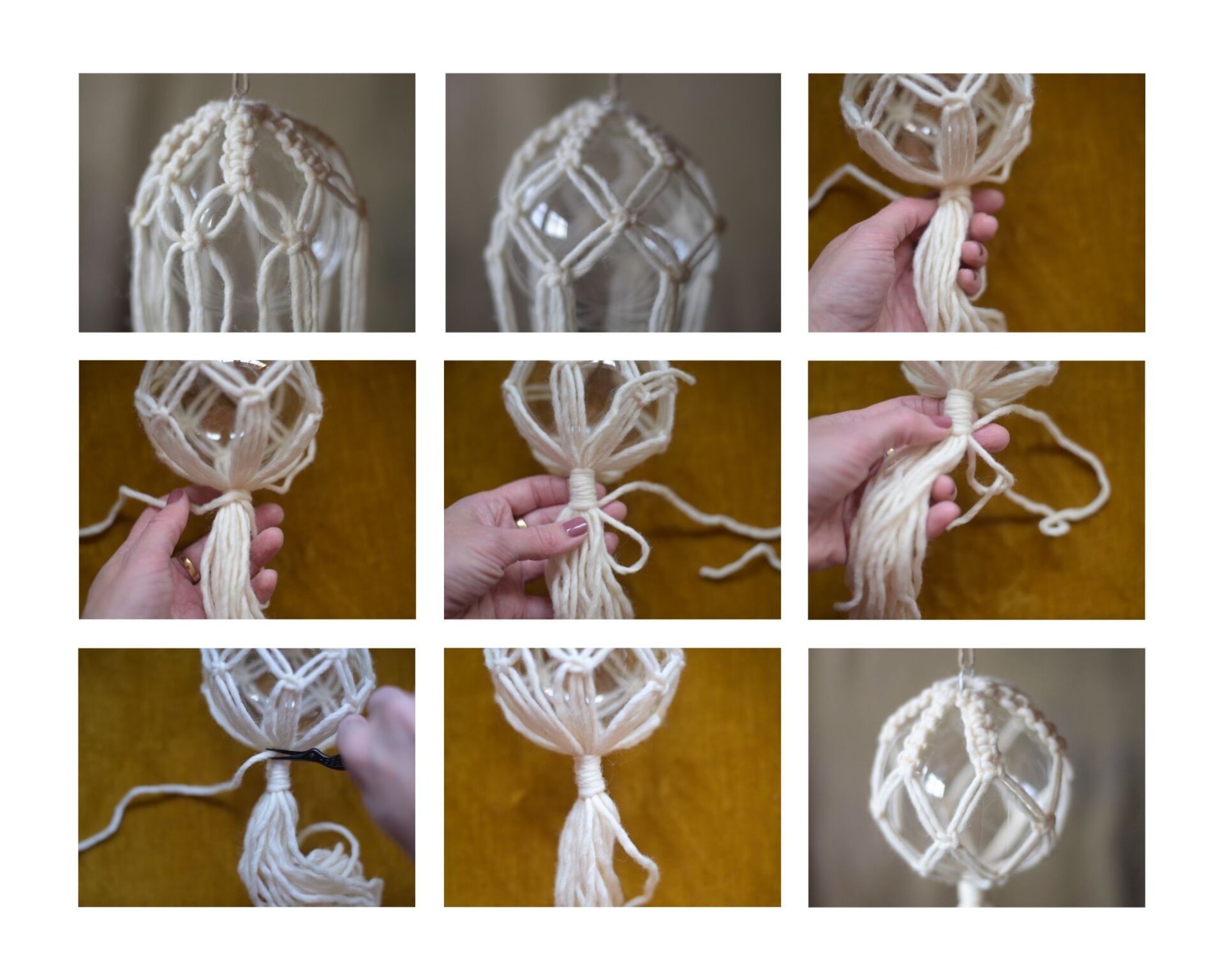 Sodass ein Netz entsteht, das die Weihnachtskugel umspannt, wird das versetzte Kreuzknotenmuster verwendet. Hierfür werden die Fäden neu gruppiert. 2 Fäden aus einen Vierergruppe und 2 Fäden aus der daneben liegenden Vierergruppe werden mit ein wenig Abstand wieder mit einem Kreuzknoten verknüpft. Dies wird die ganze Runde so weitergeführt. Der selbe Vorgang wird noch einmal wiederholt, bevor die Fäden der Filzwolle unterhalb der Kugel mittels eines Zier- oder auch Wickelknotens genannt, zusammengebunden werden.