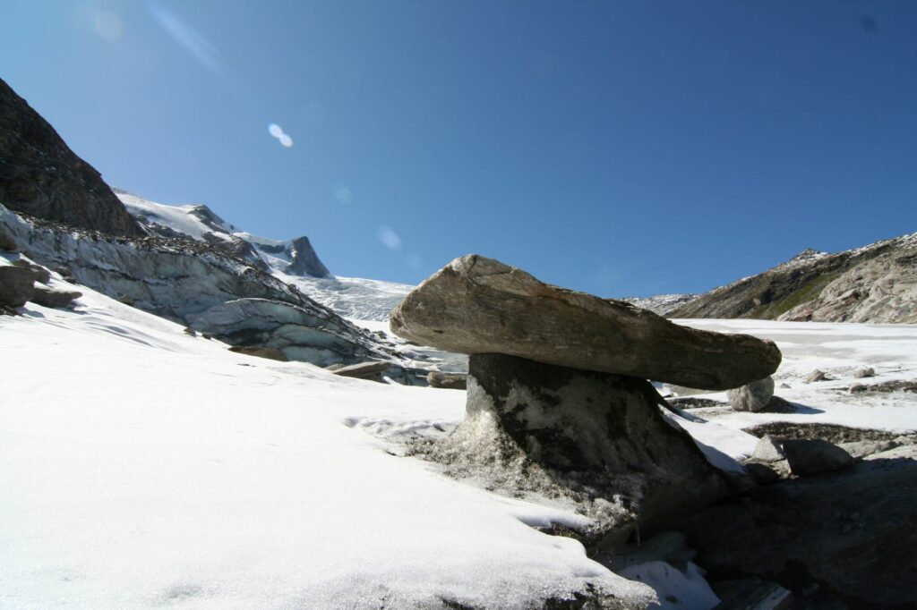 Die Bezeichnung Gletscher stammt vom lateinischen Wort „glacies“ und bedeutet Eis. Auch die in Osttirol übliche Bezeichnung Kees kommt aus dem althochdeutschen und bedeutet Eis bzw. Frost. Jeder Gletscher besteht aus Eis und darf sich nur Gletscher nennen, wenn die Eismassen mindestens ein Jahr alt sind. Durch Schneefall, Lawinen, Windverfrachtung oder auch mitgerissenen Steinen gewinnt ein Kees an Masse, doch die warmen Temperaturen lassen die gigantischen Riesen immer kleiner werden. Gletscher sind ständig in Bewegung und „fließen“ den Berg hinunter. Hast du gewusst, dass alles, was auf und im Gletscher ist (Schutt, Schnee, Luft etc.) als Teil des Gletschers betrachtet wird?