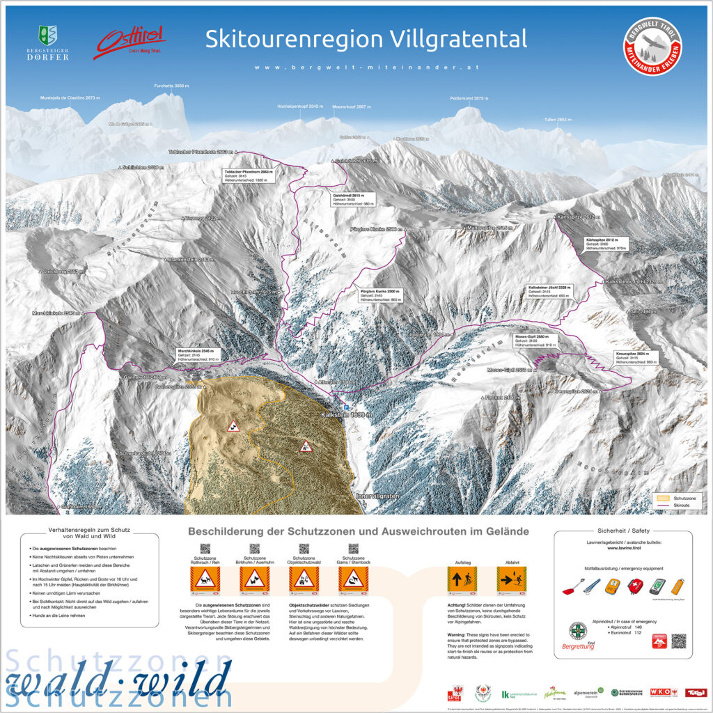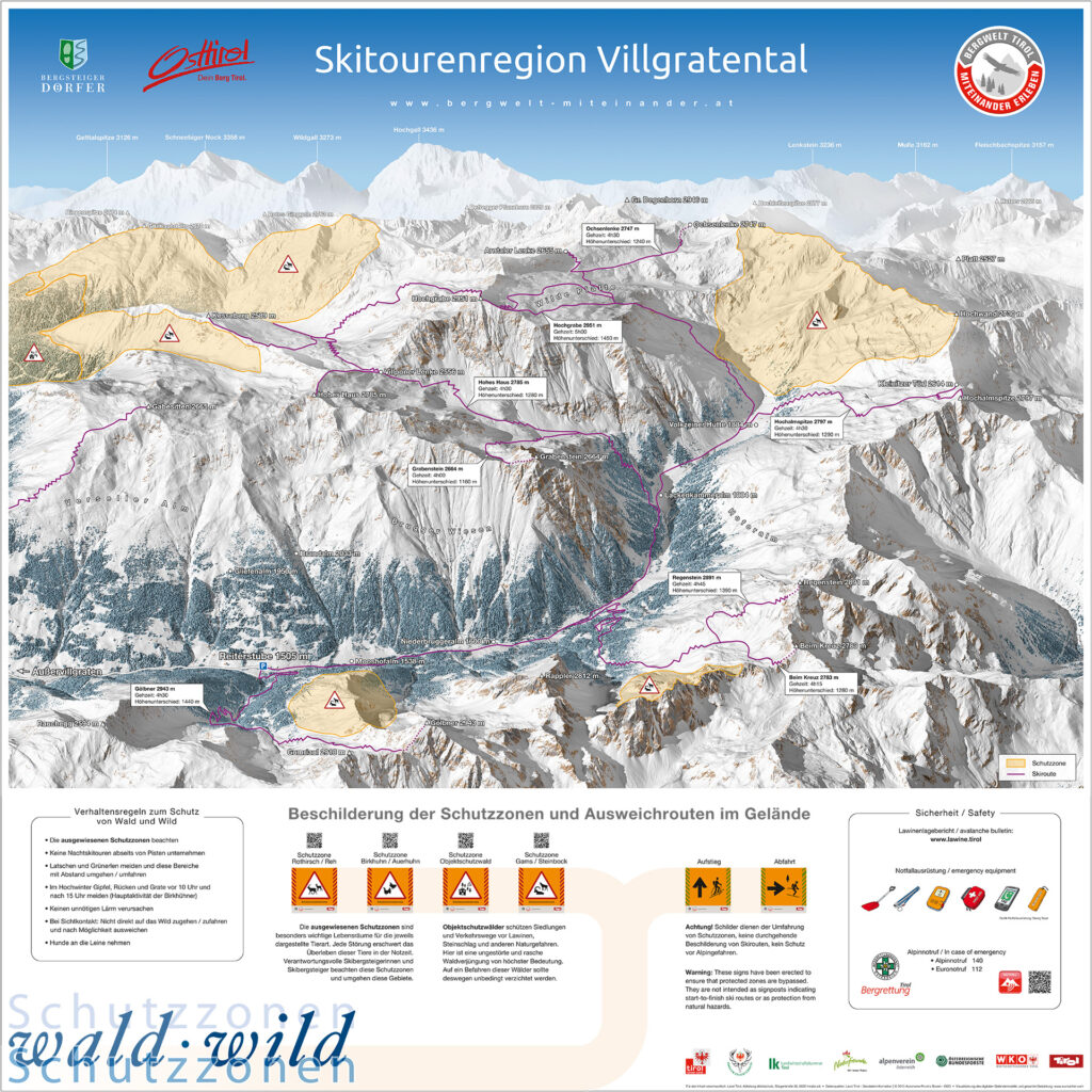 Wie seinerzeit im Osttiroler Villgratental. Es dient im Winter 2015 als Pilotregion für das Projekt Bergwelt Tirol – miteinander erleben. Dort sollen Wildtiere in ihrem natürlichen Lebensraum weniger, Berggeher aber nicht zu stark auf ihren Wegen, beeinträchtigt werden. „Deshalb haben wir Futterstellen für das Rotwild verlegt und das Wegenetz behutsam verändert“, erinnern sich Mitwirkende der Arbeitsgruppe Villgratental. „Seither gibt es etwa für Skitourengeher spezielle Aufstiegs– und Abfahrtshinweise in Form von Lenkungstafeln.“ Gleiches kann auch auf Schneeschuhwanderer und Mountainbiker ausgedehnt werden.