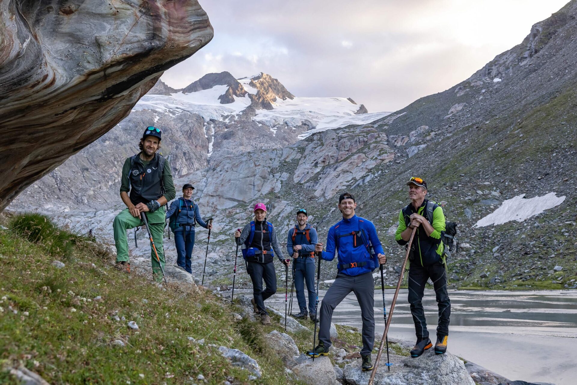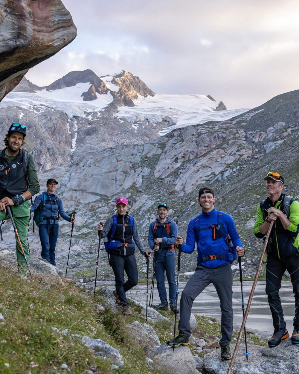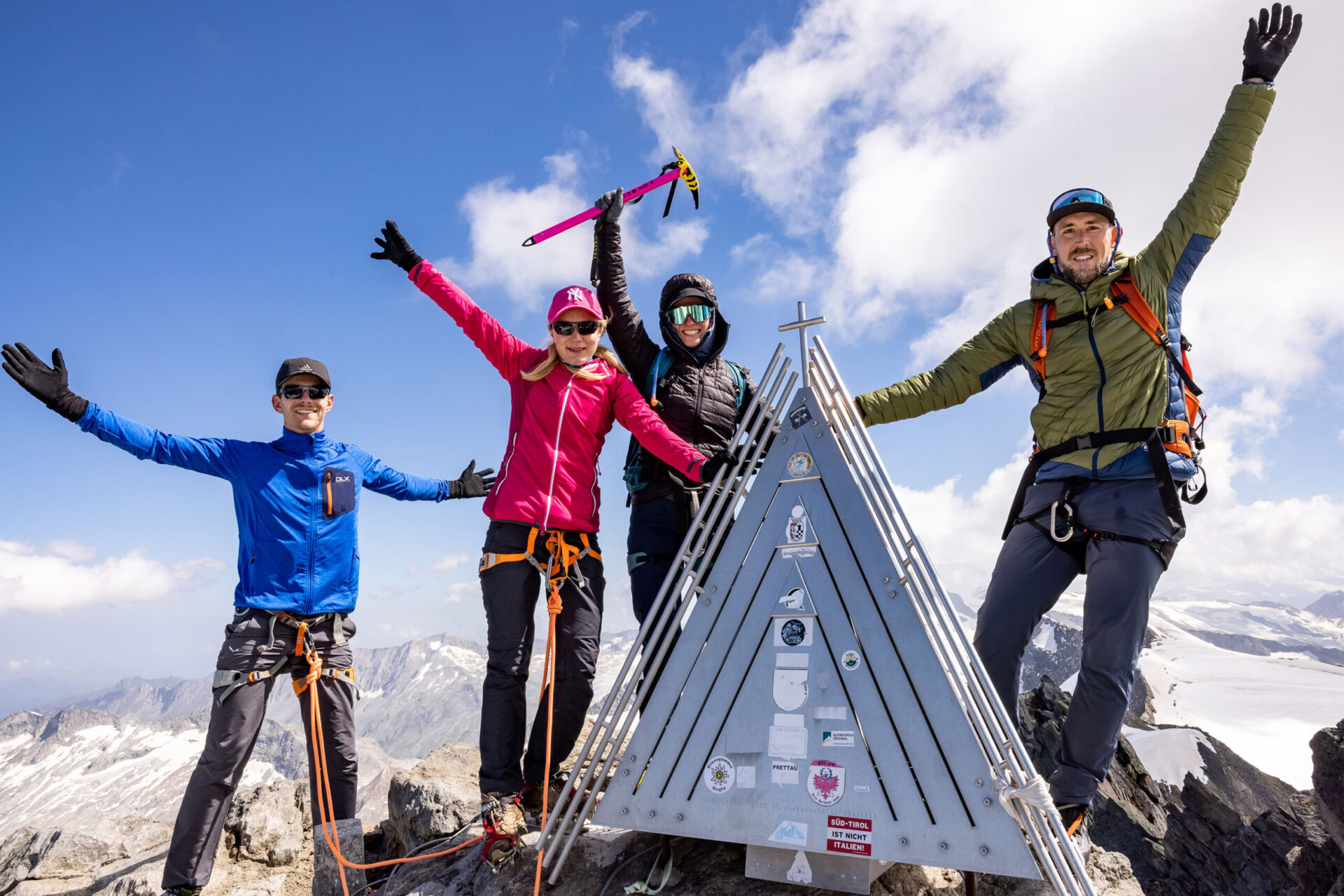 Warum die vier durchaus sportlichen Weitwanderer am Ende der fünften Etappe auch ihre Kraftreserven fast verbraucht hatten, erklärt sich aus einem besonderen Highlight, das normalerweise nicht Bestandteil der Trailroute ist: Begleitet von den Bergführern Sigi Hatzer und Christian Riepler machten sie nicht beim Ursprung des Gletscherflusses am Umbalkees halt, sondern nahmen mit der Dreiherrenspitze auch noch einen 3.499 Meter hohen Gipfel in Angriff.